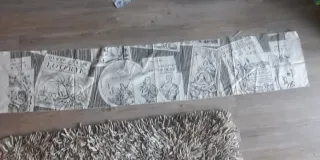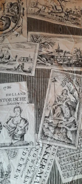 Conjunto de tres retales de tela con diseño vintage, inspirados en grabados históricos. Medidas 35x78 53x44 150x38 Perfecto para bolsos, fundas, neceser, cojines, pachwork, cuadros,etc - Diseño con escenas de barcos, puentes y paisajes. - Motivos con retratos y partituras. - Estampado con texto en holandés antiguo.
