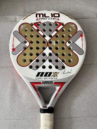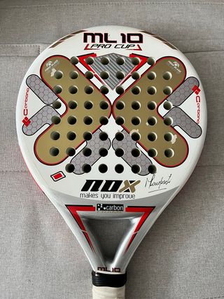 Pala de pádel Nox ML 10 Pro Cup, diseñada para mejorar tu juego. Presenta un acabado blanco con detalles dorados y rojos. - Marco de carbono. - Superficie de fibra de vidrio. - Diseño con agujeros característicos.