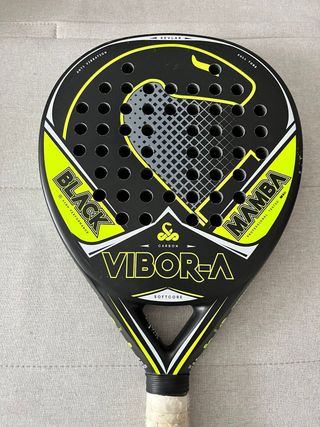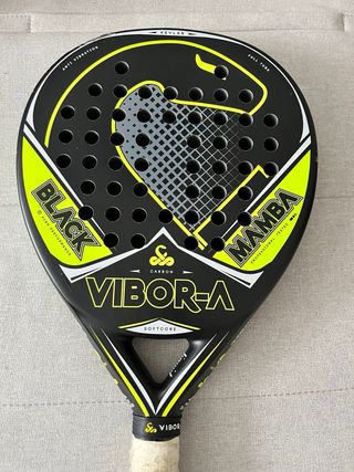 Pala de pádel Vibor-A Black Mamba en color negro y amarillo. - Pala de pádel Vibor-A. - Modelo Black Mamba. - Material: Carbon. - Tecnología: Full Tube, Anti Vibration, Softcore, Kevlar.