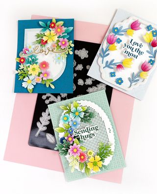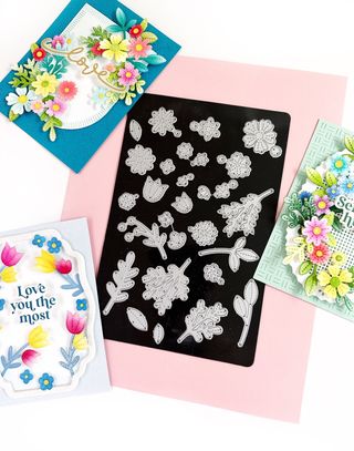 Conjunto de sellos y troqueles de la colección Captivating Floral Swag de Altenew. - Incluye sellos con diseños florales y frases. - Troquel a juego para recortar los diseños. - Stencils para añadir textura y detalles.