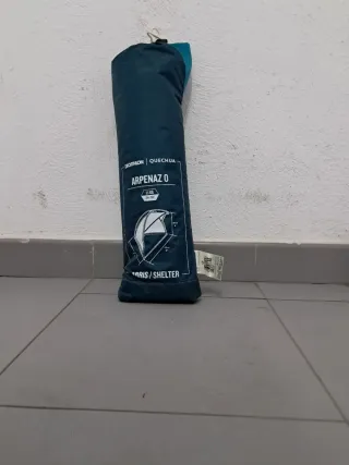 Tienda de campaña compacta y ligera, modelo Arpenaz 0 de Quechua. - Color azul marino y turquesa. - Peso: 1.1 kg. - Dimensiones plegada: 29 x 10 cm. - Incluye funda de transporte.