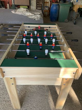 Futbolínes profesional, ideal para entretenimiento.y campeonatos madera maciza 50 años fabricando los mismos futbolines particulares sin monedero 450€ con monedero 620€ modelo Madrid jugadores de madera barnizados interperie color natural zona norte Madrid Manuel Medidas 1.45cms largo 80 cms ancho con barras 1.23cms 90cms alto 90kg - Construcción robusta en madera. - Campo de juego verde. - Varillas metálicas con jugadores. - Mangos ergonómicos negros.