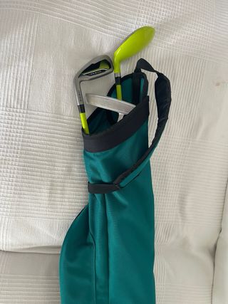 Conjunto de palos de golf para niños golfistas zurdos. Incluye varios palos para diferentes golpes. Ideales para empezar - Palos con varillas de color verde lima. - Diseño adaptado para niños y niñas.