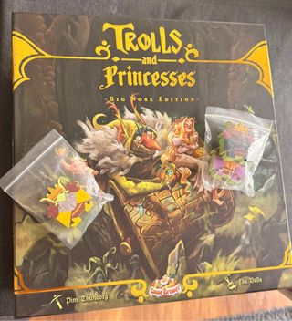 Juego de mesa de Trolls and Princesses en castellano. Edición Big Nose que es la edición de Kickstarter pero en castellano. Incluye dos reyes trolls adicionales que he pintado para poder usarlo de belén! Los compré aparte al proveedor, que los vendían por separado. Los componentes del juego no los he tocado, solo he pintado esos dos trolls extras que compré aparte. Está impoluto. Como nuevo. Todos los componentes en bolsas para facilitar el sacarle a mesa.