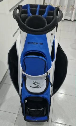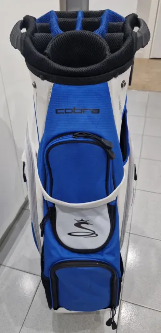 Bolsa de golf de la marca Cobra, con un diseño moderno en colores azul y blanco. - Compartimentos superiores para palos. - Múltiples bolsillos con cremallera en perfecto estado todas. - Asa superior para facilitar el transporte. - Logo de Cobra visible. - Muy poco uso.