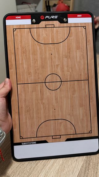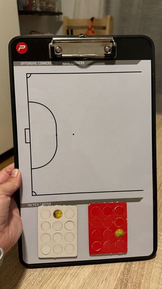 Pizarra táctica para fútbol sala La pizarra está perfecta. Las fichas están algo mas desgastadas (ver fotos) - Superficie magnética (tanto delante como detrás) - Se puede escribir con rotulador por ambas caras - Incluye fichas magnéticas de equipo local y visitante - Pinza para hojas - No incluye el rotulador de veleda (vale cualquier rotulador de pizarra de veleda) - Por un lado está la pista entera de fútbol sala y por el otro medio campo