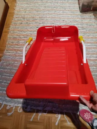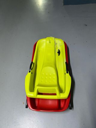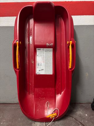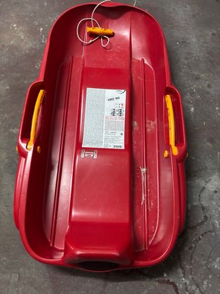 Trineo de plástico rojo para deslizarse por la nieve. - Incluye tirador para facilitar el arrastre y palancas de frenos en ambas manos - Diseño ergonómico para mayor comodidad. Tiene muy poco uso