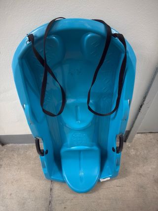 Trineo de arrastre azul, perfecto para los más pequeños en la nieve. Diseñado para la diversión y seguridad. Como nuevo, en perfectas condiciones. - Incluye cinturón de seguridad. - Con asa de arrastre. - Decoración de muñeco de nieve.