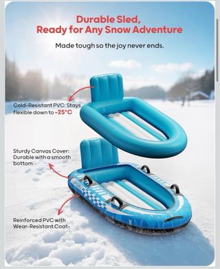 Trineo inflable con diseño deportivo, ideal para disfrutar en la nieve. - Capacidad para dos personas. - Asiento con respaldo inflable. - Asas de agarre resistentes. - Incluye cuerda para arrastrar.