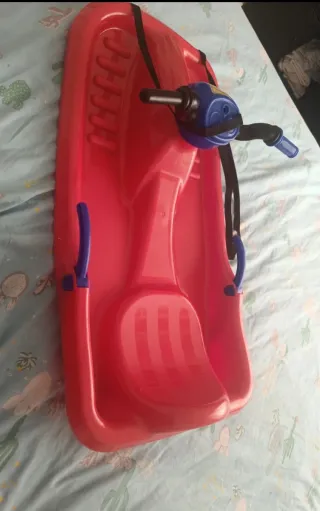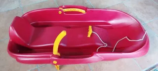 Trineo de plástico rojo para deslizarse en la nieve. Diseñado para niños, cuenta con un manillar para dirigir y asas laterales para sujetarse. - Color: Rojo - Material: Plástico - Incluye manillar y frenos en los laterales ****Negociable****