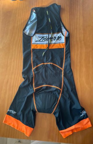 Tritraje de triatlón Inverse en color negro con detalles en naranja y blanco. Con cierre en la espalda. Usado en un entreno y una competición. Badana en perfecto estado. - Diseño sin mangas. - Cremallera en la espalda. - Banda ancha naranja en el pecho. - Logos de Inverse en pecho y perneras. - Costuras en contraste naranja. #Trimono #Trisuit