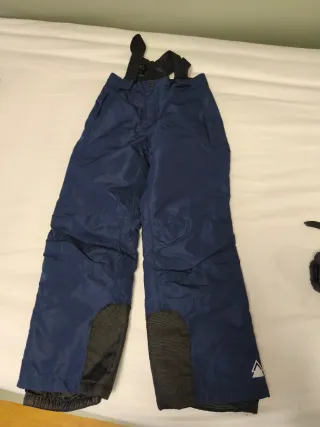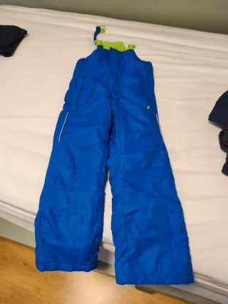 Pantalón de nieve azul con tirantes, ideal para mantener a los más pequeños abrigados y secos en la montaña. - Tirantes ajustables. - Tejido resistente al agua. - Talla 122/128 cm - Refuerzos en la parte inferior de las perneras. - Diseño moderno con logo triangular. - Regalo manoplas