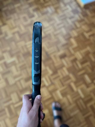 Pala de pádel Kombat Swat con un diseño llamativo. - Diseño con camuflaje azul y negro. - Logo de Kombat en la cara. - Agarre de color beige.