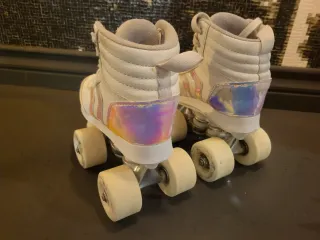Se venden patines Oxelo de cuatro ruedas en talla 28. - Color blanco con detalles iridiscentes. - Diseño de bota alta para mayor sujeción.