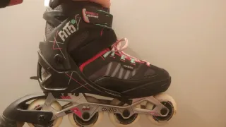Patines en línea Oxelo FSK 3 en color negro con detalles en rosa y turquesa. Diseñados para ofrecer comodidad y ajuste. - Cierre con cordones, velcro y hebilla. - Ruedas de 80mm. - Frame de aluminio. - Microajuste en la bota.