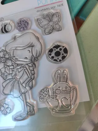 Set de sellos para manualidades de La Vida en Scrap, colección Pompas. Diseños de primavera. - Incluye 9 sellos. - Motivos: fresa, abeja, mariposa, flor, tulipán, mariquita, conejo con regadera y niña.