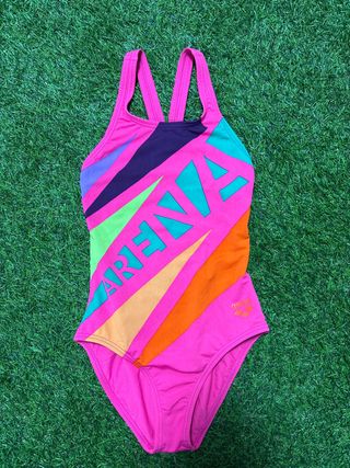 Bañador deportivo de la marca Arena con un diseño vibrante y colorido, con solo dos usos - Diseño con formas geométricas. - Logo de Arena en la parte inferior derecha. Espalda cruzada muy bonita Regalo gorro natación rosa