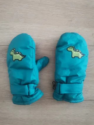 Manoplas de nieve para niños con un divertido diseño de dinosaurio. Más artículos de nieve en mi perfil. Envío rápido. IMPECABLES - Color azul turquesa. - Talla 8 años. - Cierre ajustable en la muñeca.