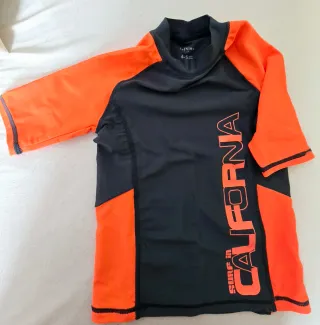 Camiseta de baño con protección solar, ideal para días de sol y agua. Diseño llamativo con mangas naranjas y panel frontal negro. - Diseño Surf in California. - Mangas cortas naranjas. - Cuello redondo. - Talla 4-5 años. Se puede usar desde los 3años,