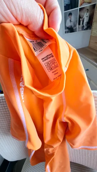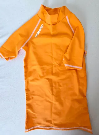 Camiseta de manga corta en color naranja, ideal para protegerse del sol. - Tejido con protección solar UV. - Costuras blancas decorativas. - Cuello alto. Es talla 6, pero yo lo use desde los 4 a 5 porque se me quedó pequeña