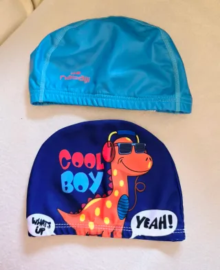 Dos gorros de natación para piscina con divertidos diseños. - Gorro azul con temática espacial (naves, estrellas, planetas). - Gorro azul marino con un dinosaurio naranja con gafas de sol y auriculares.