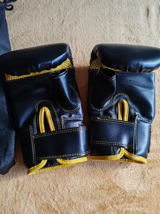 Par de guantes de boxeo de la cadena Brooklyn de fitboxing, color negro, talla L. Incluye bolsa de tela negra para guardarlos, las 2 cintas amarillas originales de Brooklyn (miden 240cm) y regalo las otras cintas rojas, son de 4 metros y mejor calidad. Todo prácticamente a estrenar, poco después de empezar mi hijo tuvo un problema de hombro y ha tenido que dejarlo.