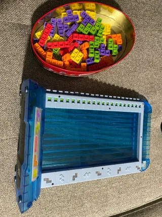 Juego de construcción tipo Tetris 3D con piezas de colores. - Incluye una bandeja de juego azul y gris. - Contiene una lata metálica roja con piezas de plástico de varios colores: rojo, naranja, amarillo, verde y morado. - Las piezas son de diferentes formas, similares a las del Tetris.
