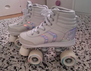 Patines de cuatro ruedas en color blanco, ideales para iniciarse en el patinaje. Cuentan con un diseño moderno y detalles iridiscentes. - Talla 32. - Cierre con cordones. - Ruedas de 54x32mm.