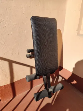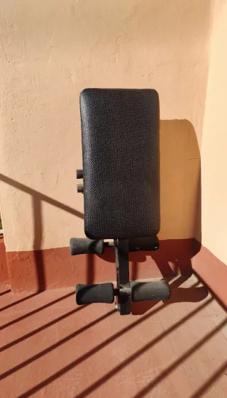 Banco diseñado para hacer abdominales. Está en buen estado, sin rotos en el tapizado, pero le falta uno de los pasadores de fijación para una de las patas, penúltima imagen, (serviría con ponerle un tornillo del diámetro apropiado) y tiene una de las esponjas deterioradas como se ve en la última imagen.