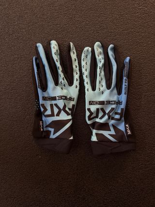 Guantes FXR en talla M, con un diseño llamativo en azul y negro. - Diseño Race Div en la palma. - Detalle Built to Conquer en el puño. - Patrón de triángulos en la parte superior.