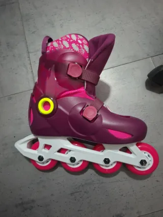 Patines en línea Oxelo de color morado, talla 32. Perfectos para iniciarse en el patinaje. - Cierre de velcro y hebilla. - Ruedas de color rosa. - Diseño con estampado floral en el interior.