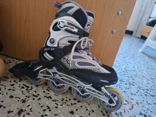 Patines en línea de la marca HB en color morado y negro. Perfectos para iniciarse en el patinaje. Talla 35-38 se ajustan. - Diseño ajustable. - Ruedas resistentes. - Cierre de velcro y cordones.