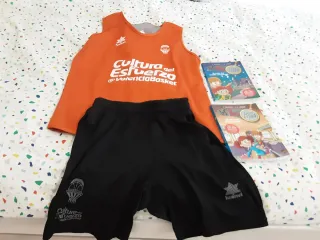 Conjunto de ropa deportiva del Valencia Basket y dos libros de la serie Los Buscapistas. - Camiseta deportiva naranja. - Pantalón corto negro. - Libro Los Buscapistas: El caso del misterio en el circo. - Libro Los Buscapistas: El caso del tesoro escondido.