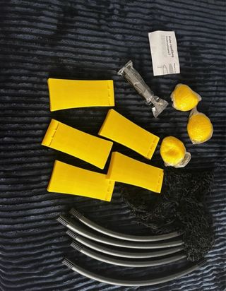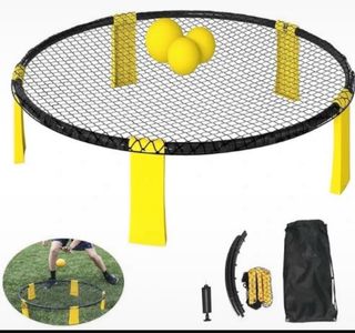 Juego de pelota y red Spikeball, ideal para exteriores. - Incluye red, 3 pelotas y bolsa de transporte. - Estructura de red circular con patas amarillas. - Diseño portátil para llevar a cualquier parte.