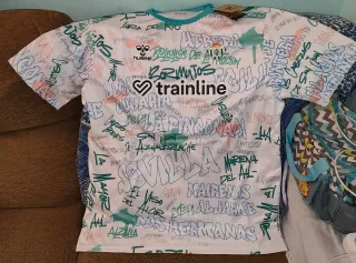 Camiseta de entrenamiento del Real Betis Balompié. - Talla 3XL. - Diseño con grafitis y nombres de localidades. - Logo de Hummel y patrocinador Trainline. - Traemos de más equipos.