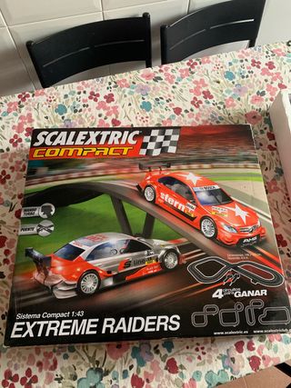 Circuito de Scalextric Compact, modelo Extreme Raiders. Incluye coches y pistas para montar diferentes circuitos. - Sistema Compact 1:43. - Incluye 4 circuitos para ganar. - Mando Turbo y Puente.