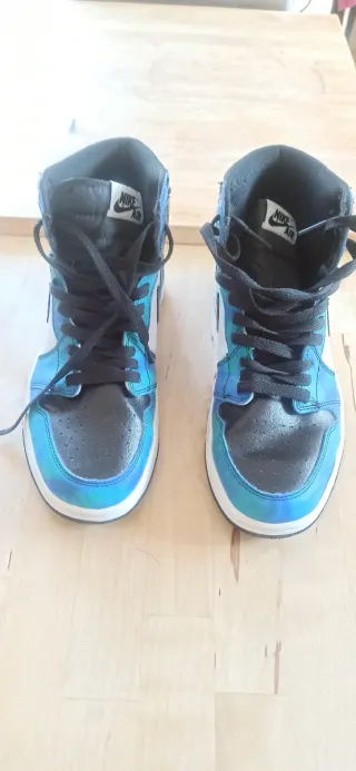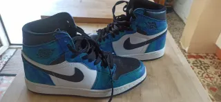 Botas Nike Air Jordan 1 High con un diseño llamativo. - Combinación de colores azul, negro y blanco. - Cierre con cordones negros. - Detalle del logo Nike Air en la lengüeta.