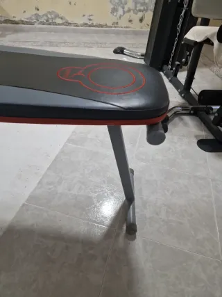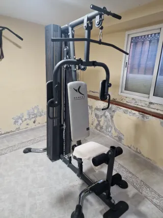 Multiestación de la marca Domyos, ideal para entrenar en casa. - Estructura robusta de acero. - Incluye poleas y cables. - Asiento acolchado.