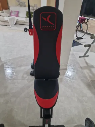 Banco de entrenamiento Domyos con diseño en negro y rojo. - Tapicería acolchada. - Estructura robusta.