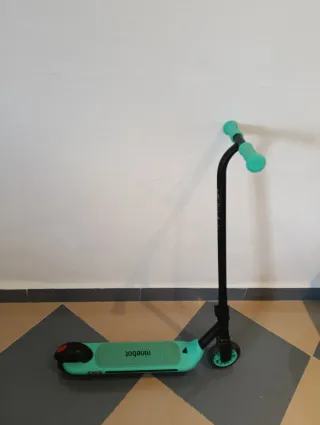 Patinete eléctrico de color verde menta, ideal para niños. Diseñado para ofrecer diversión y movilidad. - Manillar con puños de goma. - Plataforma antideslizante. - Ruedas de goma. Patinete eléctrico para niños, velocidad controlada por su movimiento, freno trasero. 3 velocidades distintas, que se cambian pulsando el freno trasero. Se iluminan los laterales del patín y las ruedas. En perfecto estado, con su cargador. Tengo 2 unidades!