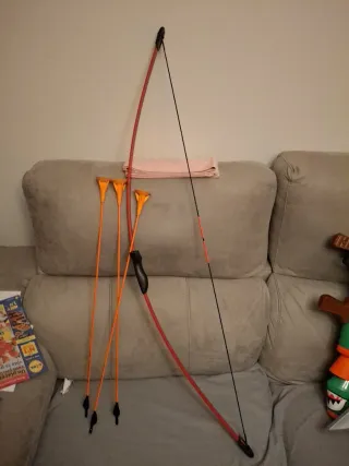 Set de arco y flechas de Decathlon, ideal para iniciarse en el tiro con arco. - Arco de color rojo y negro. - Incluye 3 flechas de color naranja con puntas de goma.
