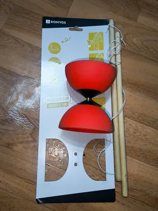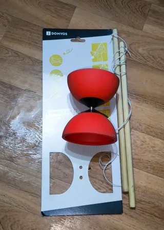 Set de diábolo infantil de color rojo, perfecto para iniciarse en este divertido juego. Incluye los palos para hacerlo girar. - Diábolo de dos copas. - Palos de madera. - Cuerda de sujeción.