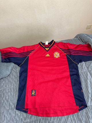 Camiseta de fútbol de la selección española. - Diseño clásico en rojo y azul marino. - Logo de Adidas y escudo de España bordados. - Detalles en amarillo en cuello y mangas.