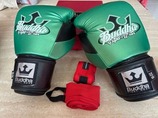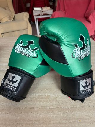 Buddha Metalic Verdes, un modelo de la marca Buddha Sports diseñado específicamente para disciplinas como el boxeo, muay thai y kick Estos guantes forman parte de la gama Metalic de la serie Millenium 2.0 y destacan por su color verde metalizado con detalles en negro. Material: Están fabricados en cuero sintético de alta calidad. Diseño: Cuentan con un cierre de velcro ancho para un ajuste firme en la muñeca. Uso: Son adecuados tanto para principiantes como para entrenamiento regular de deportes de contacto Indicación 10-OZ en la correa. Se regala juego de vendas.