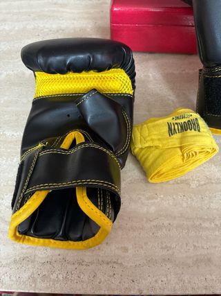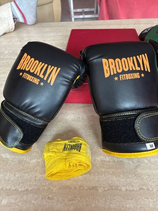 Set de guantes de boxeo Brooklyn Fitboxing en color negro. - Diseño con detalles en color naranja. - Cierre de velcro ajustable. - Incluye vendas de boxeo amarillas a juego.