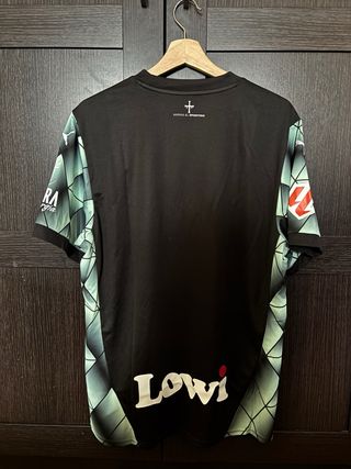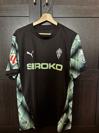 Camiseta de la primera equipación del Sporting de Gijón para la temporada 2025. Diseño moderno y cómodo. - Color principal negro. - Detalles gráficos en mangas y costados. - Logo de la marca y escudo del club. - Patrocinador principal en el frontal.