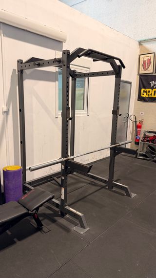 Jaula de entrenamiento multifuncional para gimnasio en casa. - Incluye barra de dominadas integrada. - Estructura robusta de acero. - Compatible con discos de pesas.