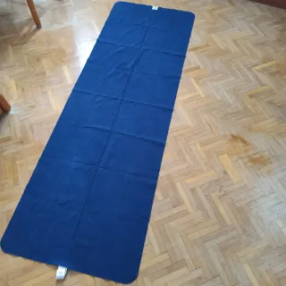Sobre-esterilla de yoga de color azul, para utilizar encima de otra superficie. Ideal para viajes porque es plegable. Marca Decathlon. Vendo por falta de uso. La lavé al comprarla y ha estado guardada en el altillo. - Base de caucho natural - Tela superior suave - Diseño alargado y rectangular. - 182 * 61 cm - Peso aproximado 550 g