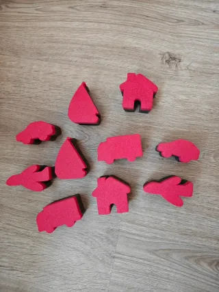 Lote de esponjas con formas para manualidades y juegos. - Incluye figuras de coches, camiones, aviones y casas. - Tiene un lado de color rojo vibrante, más duro, para presionar y marcar las formas. - El otro lado, de espuma, se moja con la pintura y se plasma en folios, cartulinas, etc.