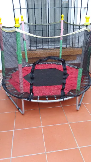 Cama elástica para niños con red de seguridad para mayor protección. Ideal para exteriores. - Estructura metálica. - Red de seguridad. - Muelles de acero. - Cubierta protectora roja y negra,está tal cual se ve en las fotos